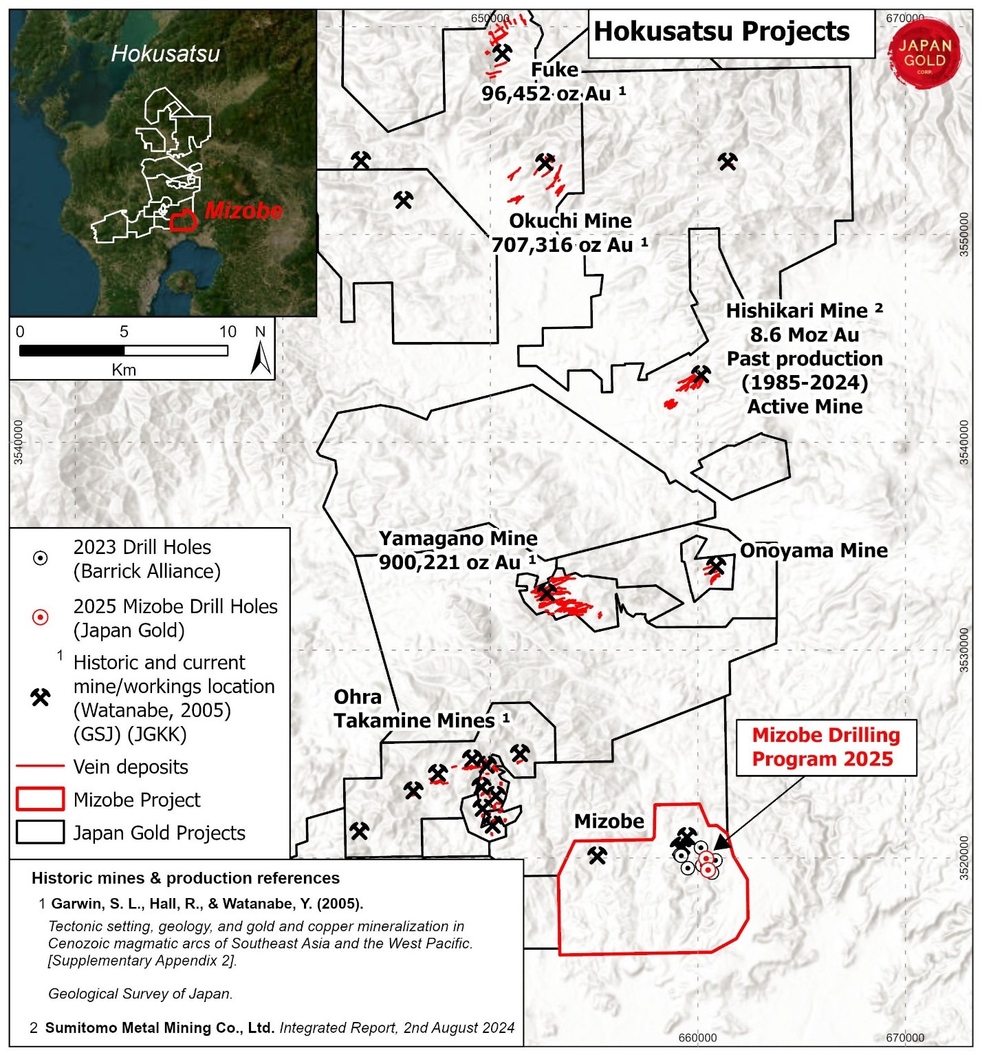 Vancouver, British Columbia--(Newsfile Corp. - January 22, 2026) - Japan Gold Corp. (TSXV: JG) (OTCQB: JGLDF) ("Japan Gold" or the "Company") is pleased to announce results from two diamond drill holes totaling 1,156 metres completed at the Mizobe Project ("Mizobe"), intersecting gold mineralization in both drill holes and recording the first intercept of a banded chalcedony vein. The Mizobe Project is located in the Hokusatsu district of southern Kyushu, Japan, approximately 23 kilometres south of the Hishikari Mine, operated by Sumitomo Metal Mining Co., Ltd. (see Figure 1).