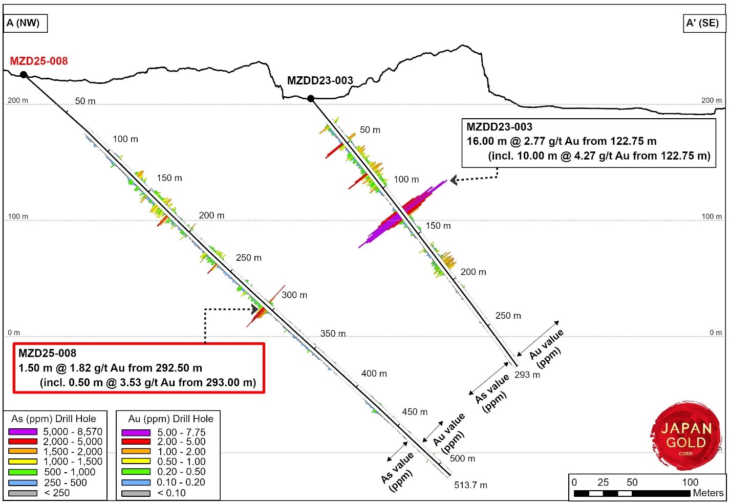 Figure 3: Mizobe cross section (2025 drill hole MZD25-008)