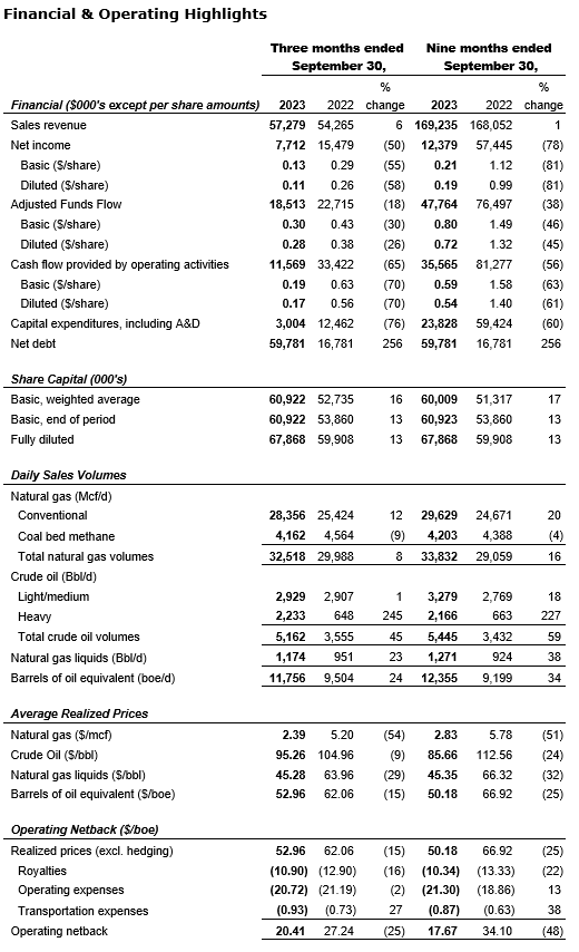 Increased daily sales volumes by 24 per cent to 11,756 barrels of oil equivalent per day in the third quarter of 2023 from 9,504 boe/d in the third quarter of 2022; year-to-date sales volumes increased 34 per cent year over year;
