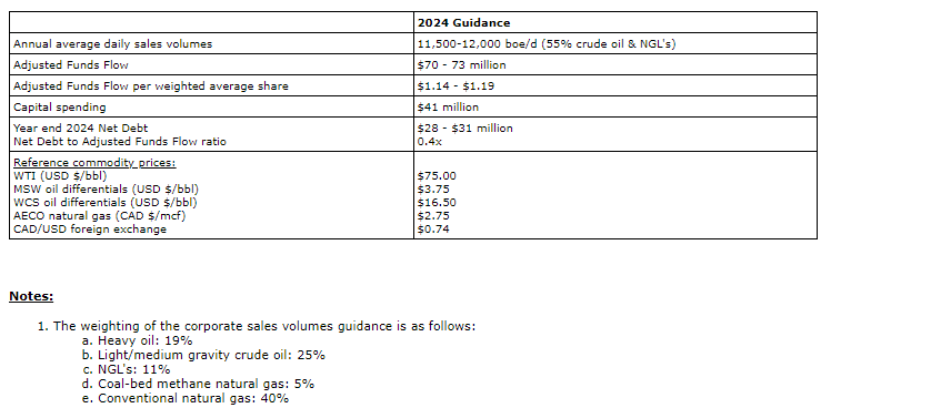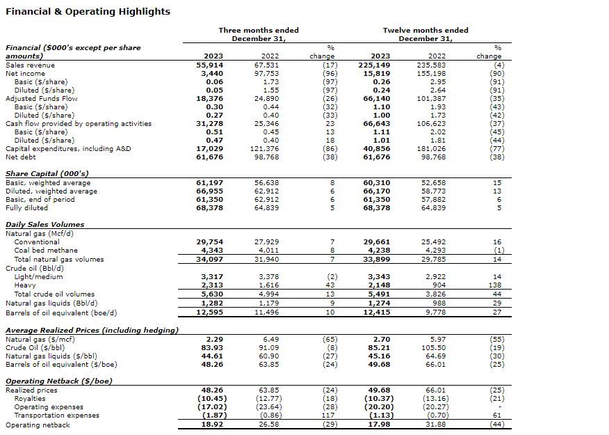 - Achieved sales volumes of 12,595 boe/d (barrels of oil equivalent per day) in the fourth quarter of 2023 and 12,415 boe/d for the entire year. Liquids volumes (crude oil and natural gas liquids) accounted for 6,912 boe/d or 55 per cent of total volumes during the quarter and 6,765 boe/d or 54 per cent for the entire year.