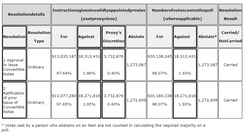 In accordance with Listing Rule 3.13.2 and Section 251AA of the Corporations Act, the details of Jervois Global Ltd.'s resolutions and the proxies received in respect of each resolution are set out in the attached proxy summary.