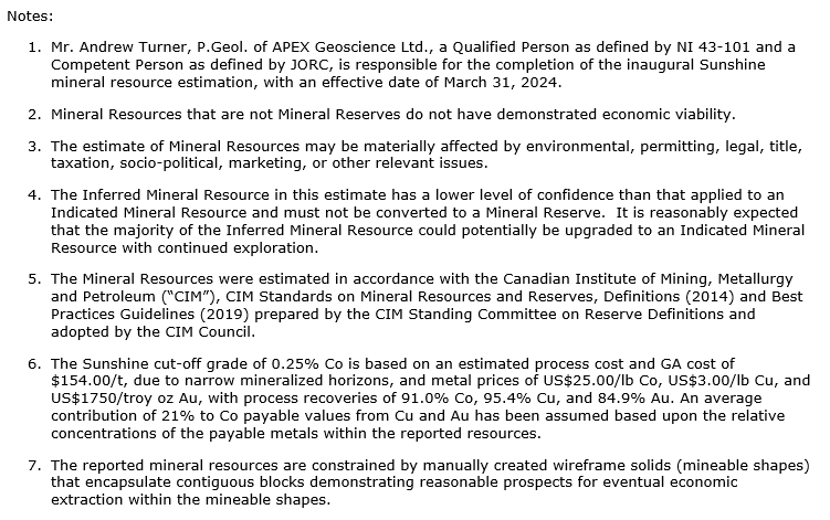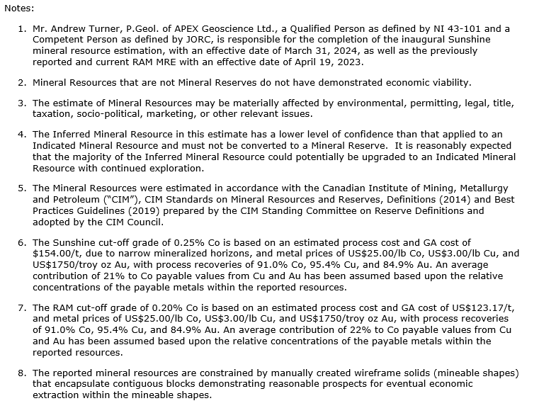 The Sunshine MRE represents the first completed objective of the program under the DoD agreement funding to advance U.S. cobalt supply chain security. Other initially agreed deliverables with the DoD are well under way, with underground drilling targeting expansion of the existing RAM mineral deposit (see table 3) as announced on March 27, 2024,