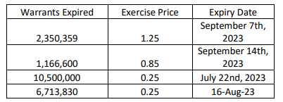 Included in the warrants that have expired were the previously Canadian Securities Exchange-listed