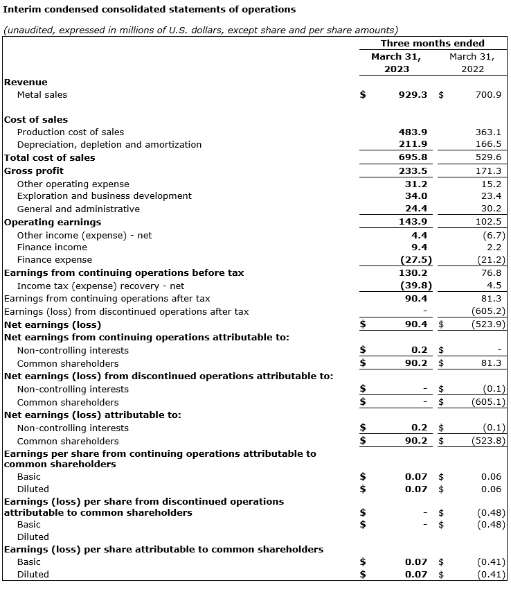 Kinross Gold Corp. has released its results for the first quarter ended March 31, 2023. Dollar amounts are in U.S. dollars unless otherwise stated.