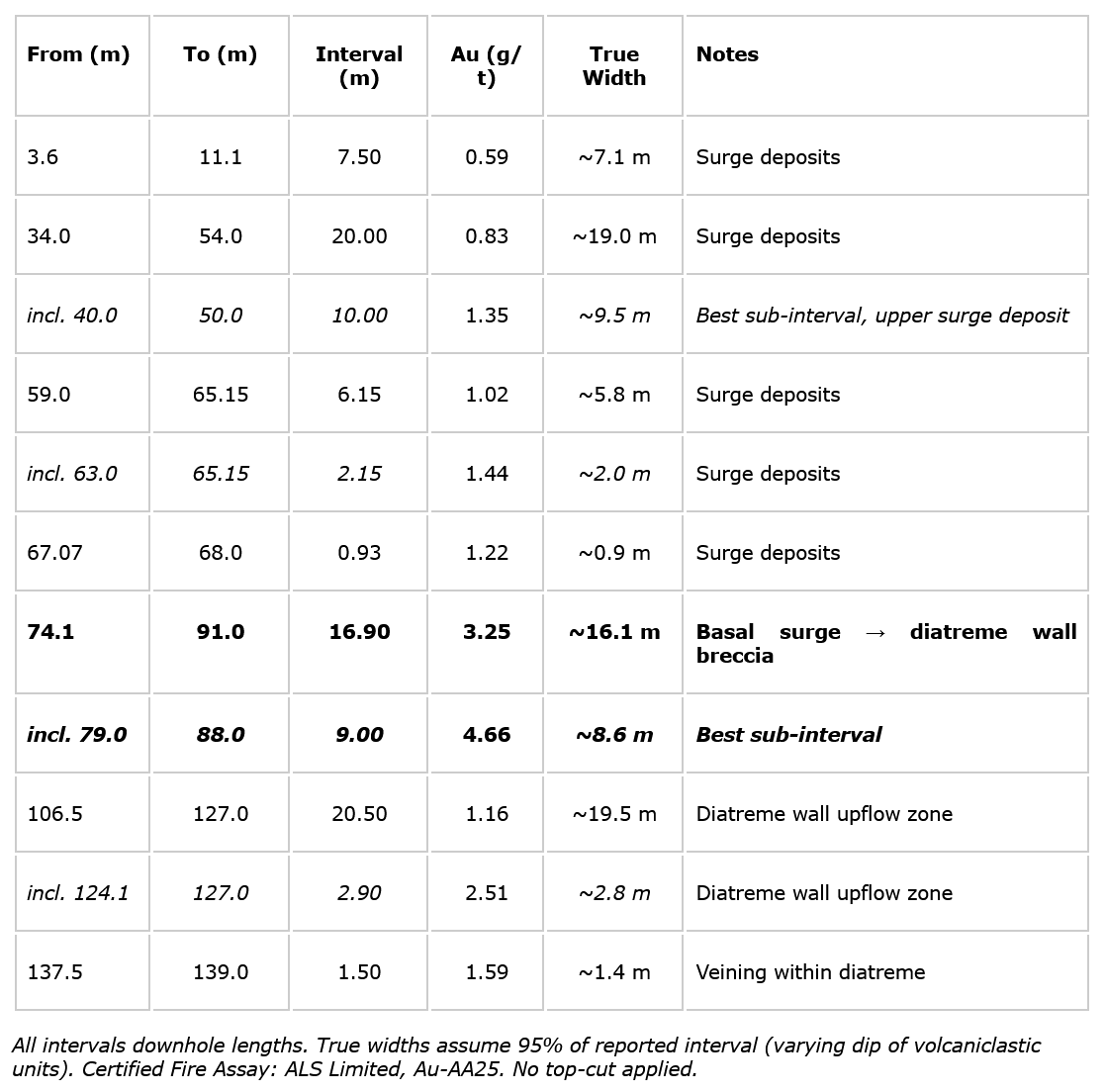 - Vertically continuous gold system confirmed -- mineralization spans from near-surface surge deposits through diatreme wall breccia into internal veining (VA26-DH17);