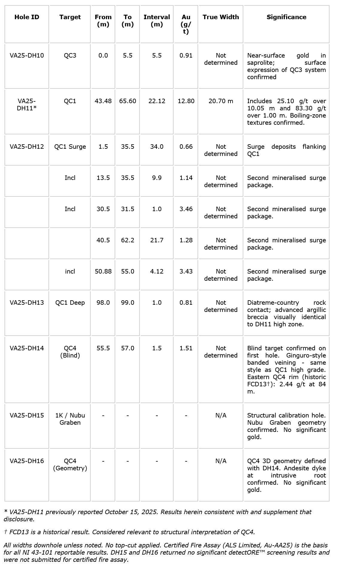 VA25-DH12 through VA25-DH17 extend the company's understanding of the Qiriyaga complex across four targets and four distinct geological settings. VA25-DH12 through VA25-DH17 confirm that drilling to date has tested the upper levels of the system while the interpreted feeder zone at approximately 395 metres depth remains untested. VA25-DH12 intersected broad intervals of mineralization within surge deposits and VA25-DH14 confirmed gold mineralization at a blind geophysical target (QC4); both directly informed the targeting of VA26-DH17.