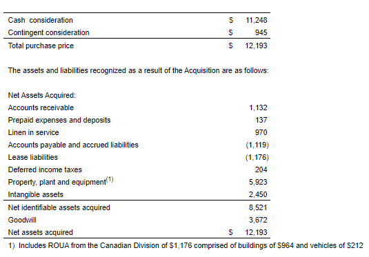 On March 1, 2023, the corporation completed the acquisition of 100 per cent of the share capital of Buanderie Para-Net (Paranet) operating as Paranet, a private laundry and linen services company operating in Quebec City, Que. The acquisition was completed through a share purchase agreement consisting of existing working capital, fixed assets, contracts and an employee base. The contracts acquired are in the Quebec health care and hospitality sector, which complements the existing business of the corporation. Based on the corporation's evaluation of the acquisition and the criteria in the identification of a business combination established in IFRS 3, the acquisition will be accounted for using the acquisition method, whereby the purchase consideration will be allocated to the fair values of the net assets acquired.