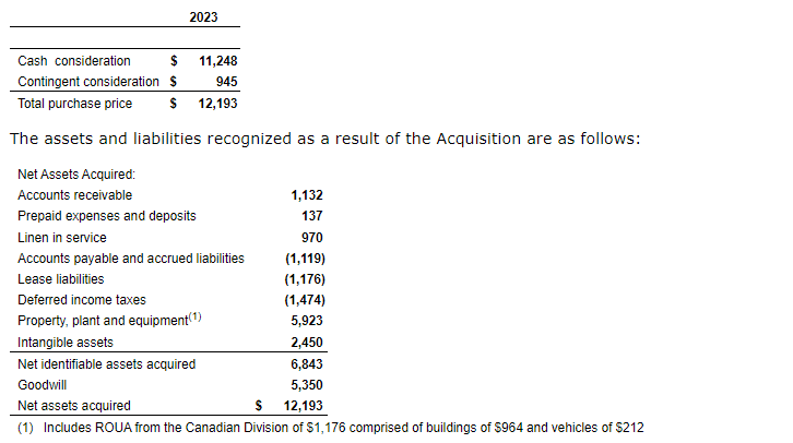 On March 1, 2023, the corporation completed the acquisition of 100 per cent of the share capital of Buanderie Para-Net (Paranet) operating as Paranet, a private laundry and linen services company operating in Quebec City, Que. The acquisition was completed through a share purchase agreement consisting of existing working capital, fixed assets, contracts and an employee base. The contracts acquired are in the Quebec health care and hospitality sector, which complements the existing business of the corporation. Based on the corporation's evaluation of the acquisition and the criteria in the identification of a business combination established in IFRS 3, the acquisition will be accounted for using the acquisition method, whereby the purchase consideration will be allocated to the fair values of the net assets acquired.