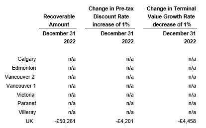The corporation performed its annual impairment assessment for goodwill for the Canadian division and for the U.K. division as at Dec. 31, 2023, and Dec. 31, 2022, in accordance with its policy described in note 2(k) and note 2(h). The corporation also performed impairment indicator assessments where there was no goodwill allocated to the CGU (cost generating unit).