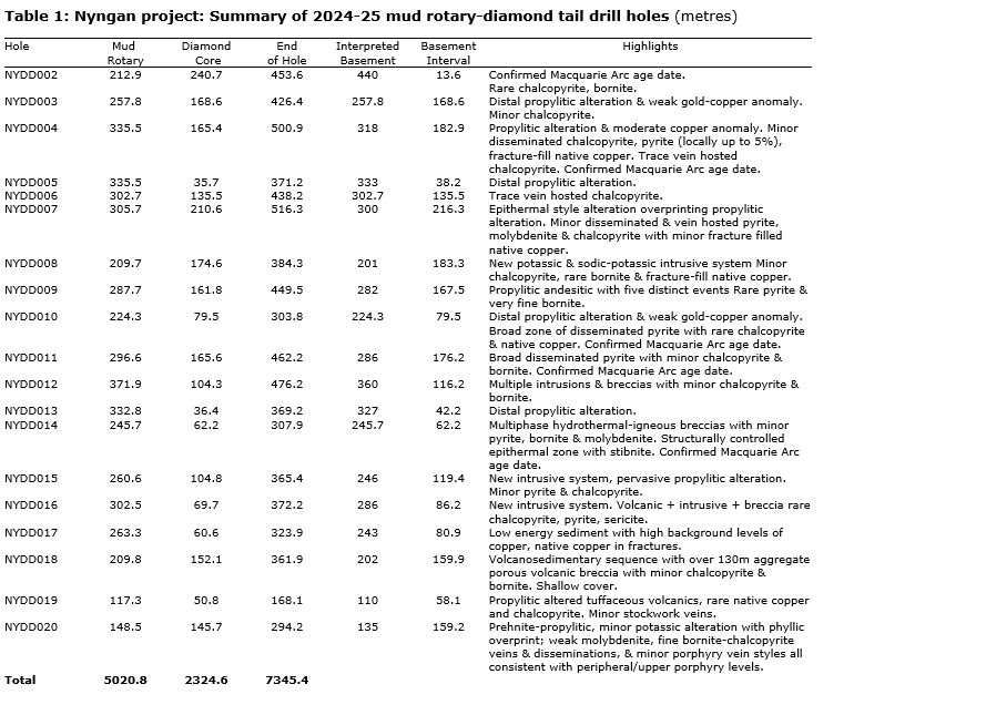 Initial scout drilling activities at the Nyngan project commenced in calendar Q4 2024 in partnership with AngloGold Ashanti under the May, 2024, earn-in agreement. A total of 19 wide-spaced scout holes for 7,345.4 m were completed and confirmed multiple newly identified interpreted Macquarie Arc composite volcanic and intrusive complexes.