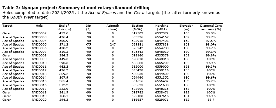 The program uses cost-effective mud rotary drilling through the relatively soft postmineral cover sequence followed by diamond core drilling (NQ3) of porphyry-prospective basement. This technique was successfully used in the first phase program at the Nyngan project.