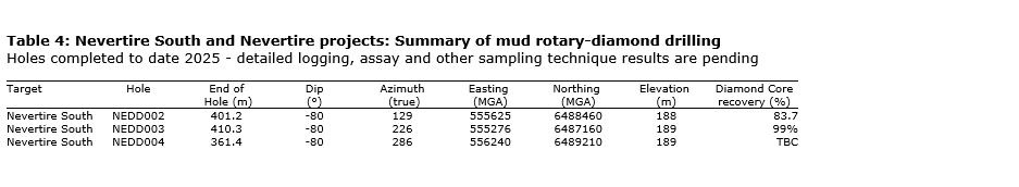 - Drilling is continuing at the highly prospective Nevertire South and Nevertire projects: