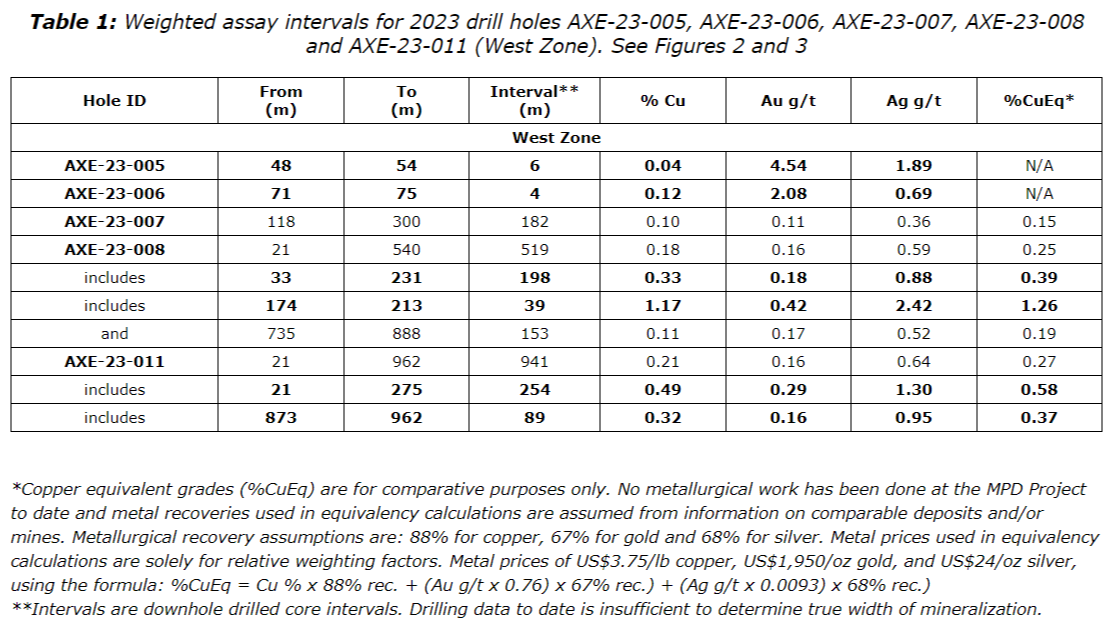 Hole AXE-23-007 extended the northern boundary of the West zone mineralized envelope with 0.10 per cent copper, 0.11 g/t Au and 0.36 g/t Ag (0.15 per cent copper equivalent) over 182 metres.
