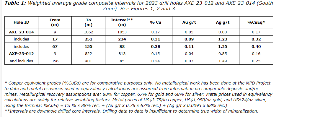 - Hole AXE-23-014 was drilled northward from the South zone and below shallow historic holes that make up the Mid Zone. The hole intersected 0.31 per cent Cu, 0.09 gram per tonne Au and 1.23 g/t silver (0.32 per cent CuEq) over 234 metres. This intercept is within a broader envelope of 0.17 per cent Cu, 0.05 g/t Au and 0.80 g/t Ag (0.17 per cent CuEq) over 1053 metres, which links both the South and Mid zones from bedrock at nine metres to 1,062 metres down hole.