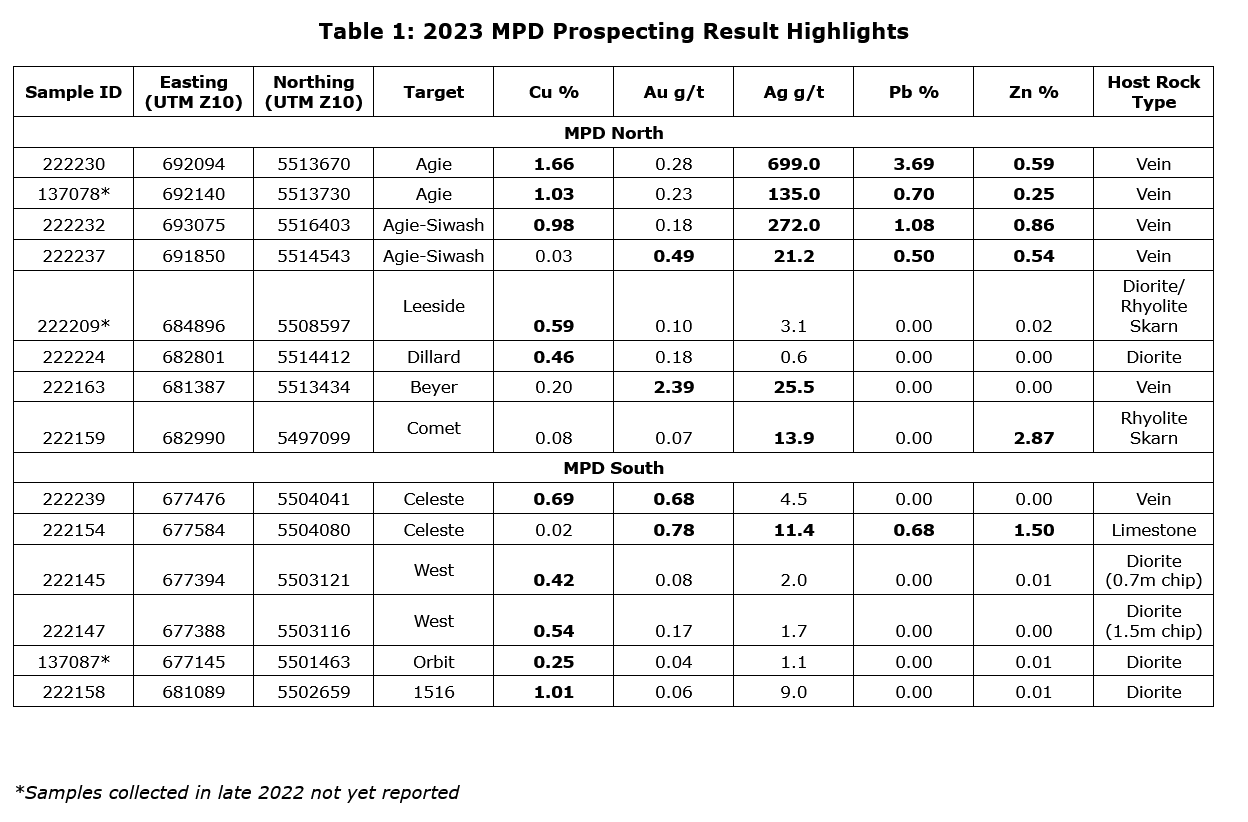 The Company collected a total of 57 rock samples from prospecting in 2023. Samples collected in both the MPD North and South Project areas continue to return significant copper porphyry mineralization (with associated gold and silver) and have identified several polymetallic showings. A select 14 assays from the 2023 prospecting, with rock type descriptions, are included in Table 1 and Figure 5.
