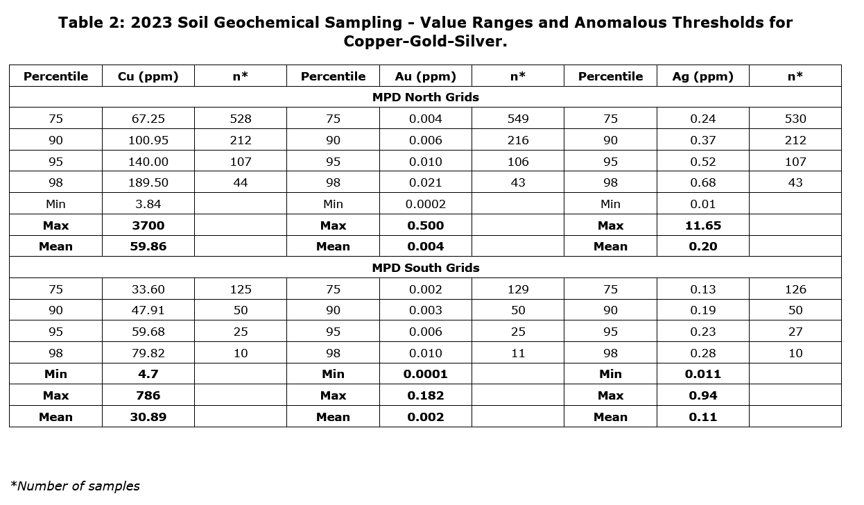 Anomalous copper values up to 3,700 ppm and gold values up to 0.500 ppm were returned from the 2023 soil sampling. With grids spread over 20 kilometres of the project area, percentile analysis was separated into the MPD North and South areas to account for differences in topography and overburden depth and are included as Table 2.