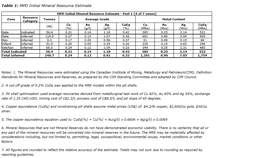 - Sizable initial copper-gold mineral resource estimate (MRE) prepared for four of seven mineralized zones outlined to date at MPD: Gate, Ketchan, Man and Dillard;