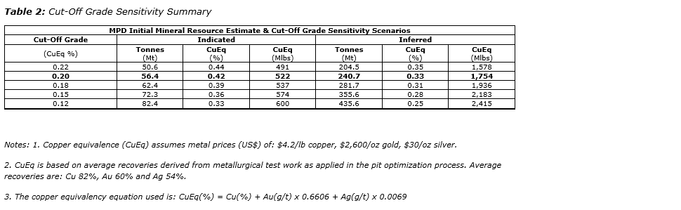 - The MRE is defined using open-pit design shells to constrain the resource models and a cut-off grade of 0.2 per cent CuEq. Sensitivity cases using lower cut-off grades have significantly higher tonnages and metal contents (see table 2);