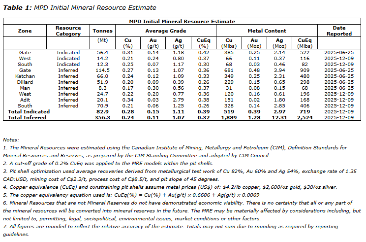 - Large, open-pit copper-gold initial mineral resource estimate (MRE), which shows the scale and potential of MPD and lays the foundation for future resource growth and development;