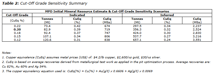 - The MRE is defined using a cut-off grade of 0.2 per cent CuEq; sensitivity cases using lower cut-of grades typical of producing mines in the area have significantly higher tonnages and metal contents (Table 2);