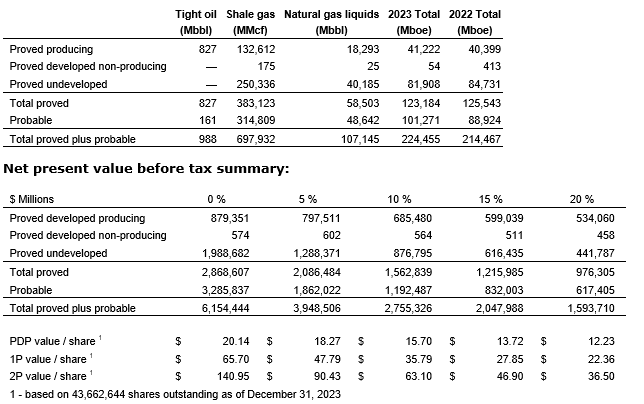 The reserves evaluation was based on the average forecast pricing of McDaniel's, GLJ Petroleum Consultants and Sproule Associates Ltd. and foreign exchange rates at Jan. 1, 2024, which are available on McDaniel's website. Reserves included herein are presented on a company gross basis and reflect the company's total working interest reserves before the deduction of any royalties and do not include any royalty interests payable to the company.