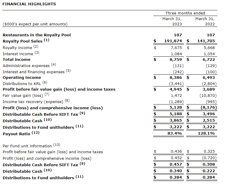 The Keg Royalties Income Fund has released its financial results for the three months ended March 31, 2023.
