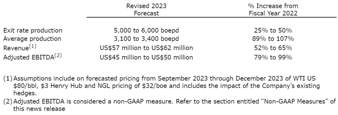 The Company expects annual capital expenditures to be in the range of US$51 million to US$56 million and net debt to be US$24 million to US$26 million. This guidance is being revised higher due to the extra well the Company added to the original drilling program and because the Company is planning to start the drilling of a ninth well at the end of the year that will be part of a new 3 well pad that we expect to start producing in early 2024. The Company continues to anticipate that its Debt to Adjusted EBITDA ratio will be less than 1 times at the end of 2023.