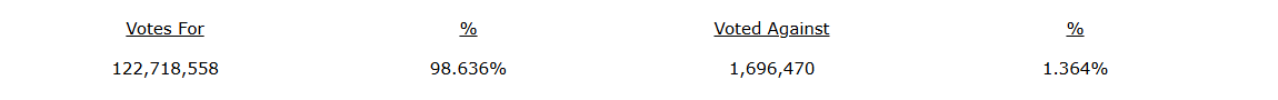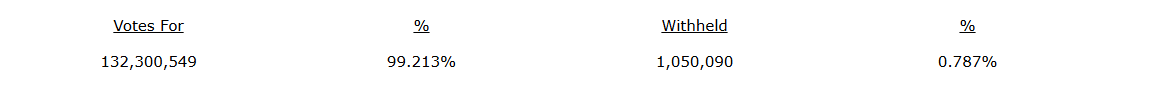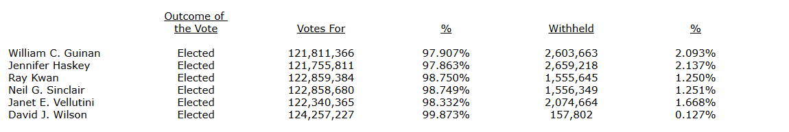 All of the nominees proposed as directors of the company were duly elected as directors of the company, with votes cast by the shareholders present in person or represented by proxy at the meeting by way of a ballot (see an attached table).