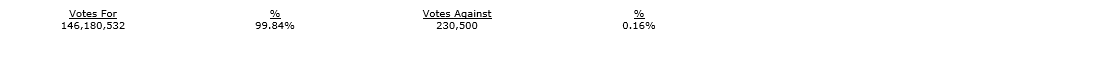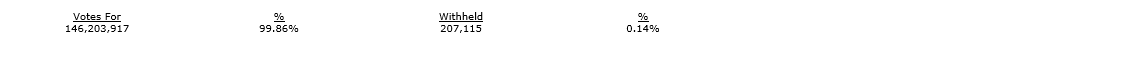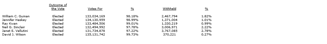 All of the nominees proposed as directors of the company were duly elected as directors of the company with votes cast by the shareholders present in person or represented by proxy at the meeting by way of a ballot, as detailed in an attached table.