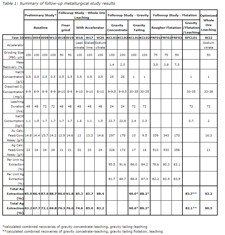 The effects of grinding size on whole ore leaching from the preliminary study showed the highest Au recoveries (up to 89.9 per cent) when decreasing grind size from baseline 100 micrometres to 75 micrometres. Testing from the follow-up study reduced grind size to 50 micrometres, increasing recoveries up to 91.8 per cent for Au and 76.3 per cent for Ag.