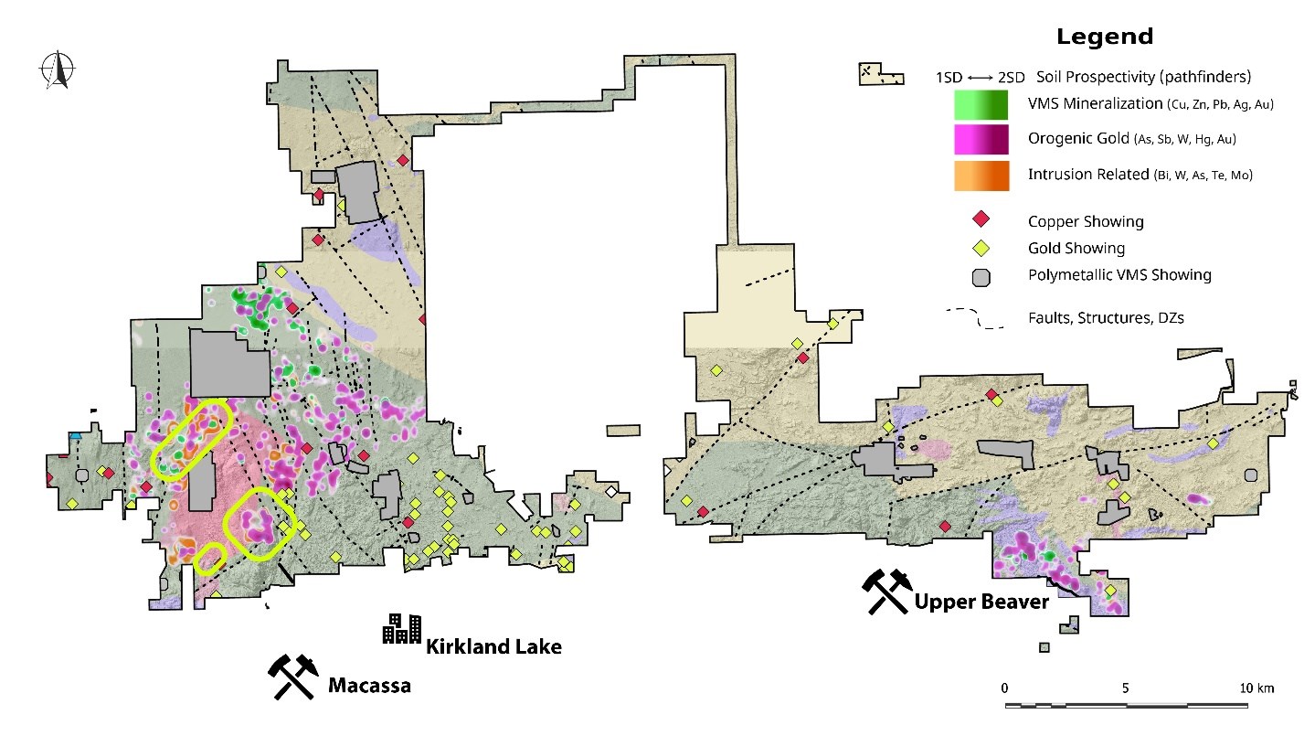 This dual-system framework significantly enhances the Company's discovery potential within the prolific Archean Abitibi Greenstone Belt, one of the world's most productive gold camps. Multiple target zones around the WLS highlight the geological importance of both the syn-volcanic emplacement of the intrusion into mafic volcanic rocks and the subsequent regional deformation events that redistributed gold-bearing hydrothermal fluids. These processes have created a highly prospective environment for new gold and polymetallic discoveries.