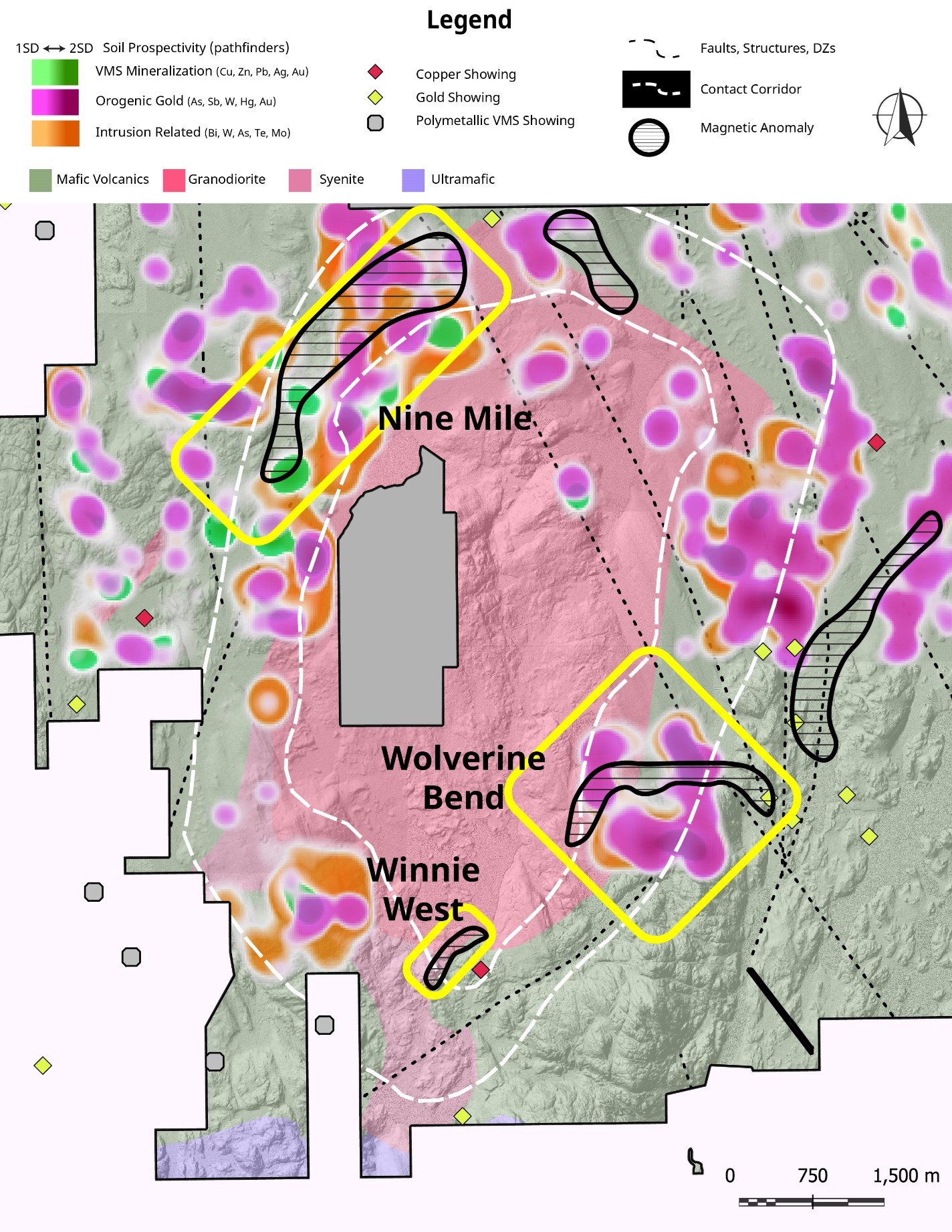Figure 2 - The newly discovered Wolverine Bend gold/critical metals occurrence, the untested Winnie West target, and Nine Mile target. The convergence of interpreted structures, soil anomalies (up to 2x standard deviation), zones of magnetic destruction, and additional proximal gold showings makes Wolverine Bend a compelling first priority for the 25,000-metre drill program.