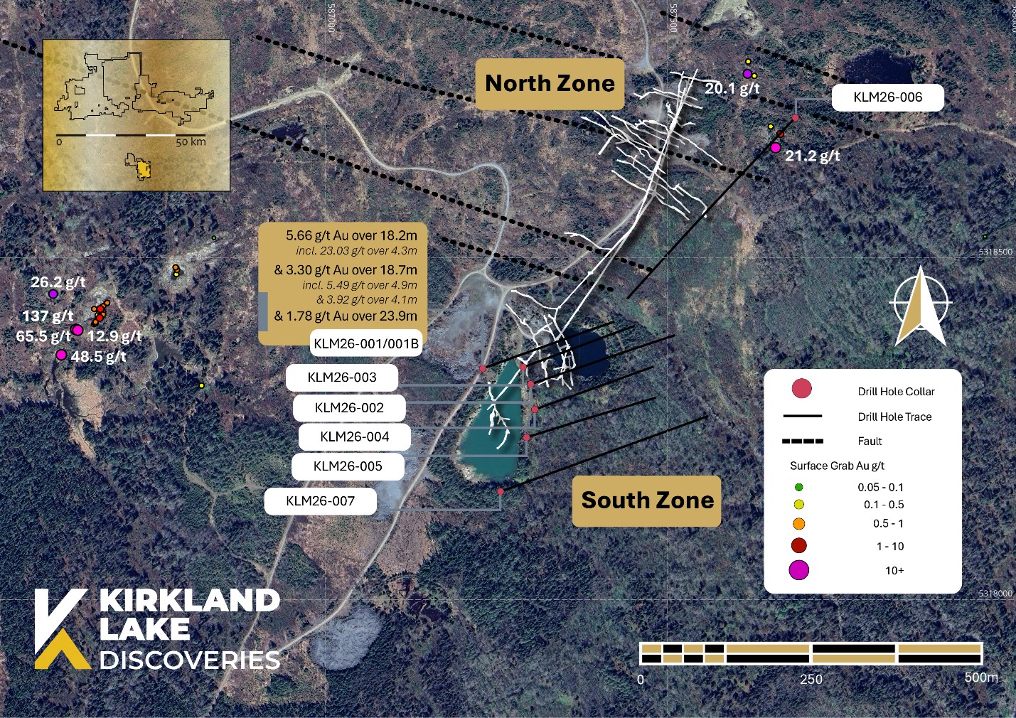 Toronto, Ontario--(Newsfile Corp. - April 16, 2026) - Kirkland Lake Discoveries Corp. (TSXV: KLDC) (OTCQB: KLKLF) ("KLDC" or the "Company") is pleased to announce assay results from its ongoing 2026 diamond drilling program at the past-producing Mirado property, located 20 km southeast of Kirkland Lake, Ontario.