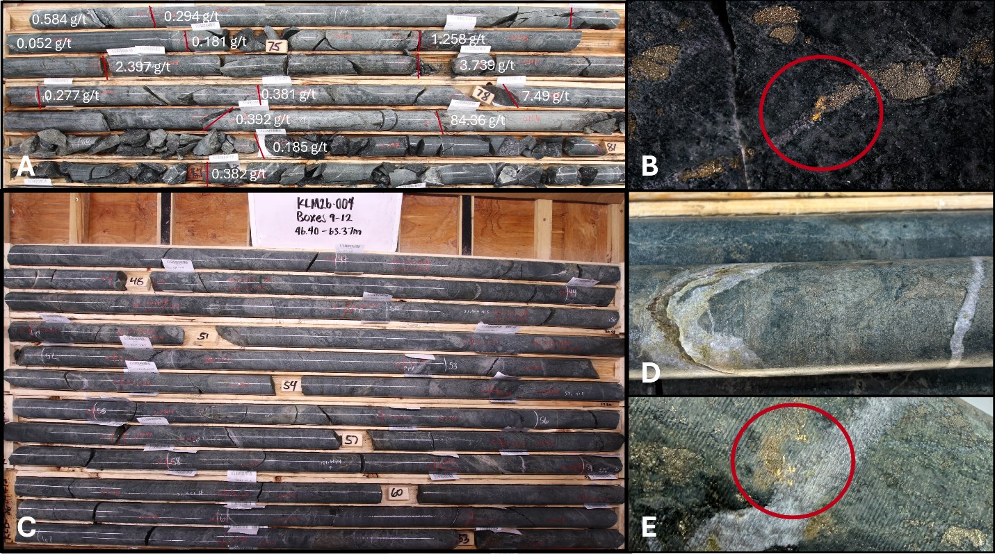 Figure 2 - Mirado drill core: A - KLM26-001 from 73.28 m to 85 m. B - KLM26-001 from 96.65 m to 97.3 m, visible gold. C - KLM26-004 from 46.4 m to 63.37 m, assays pending. D - KLM26-004 from 58.7 m to 58.9 m. E - KLM26-004 visible gold at 58.9 m. The company cautions that the presence of visible gold mineralization is not indicative of high-grade gold assays and that drill core samples will be or have been submitted to a certified laboratory for analysis of gold content. Assay values for the discussed intervals will be released when available. All intervals are downhole depths, and true widths are not known at this time.