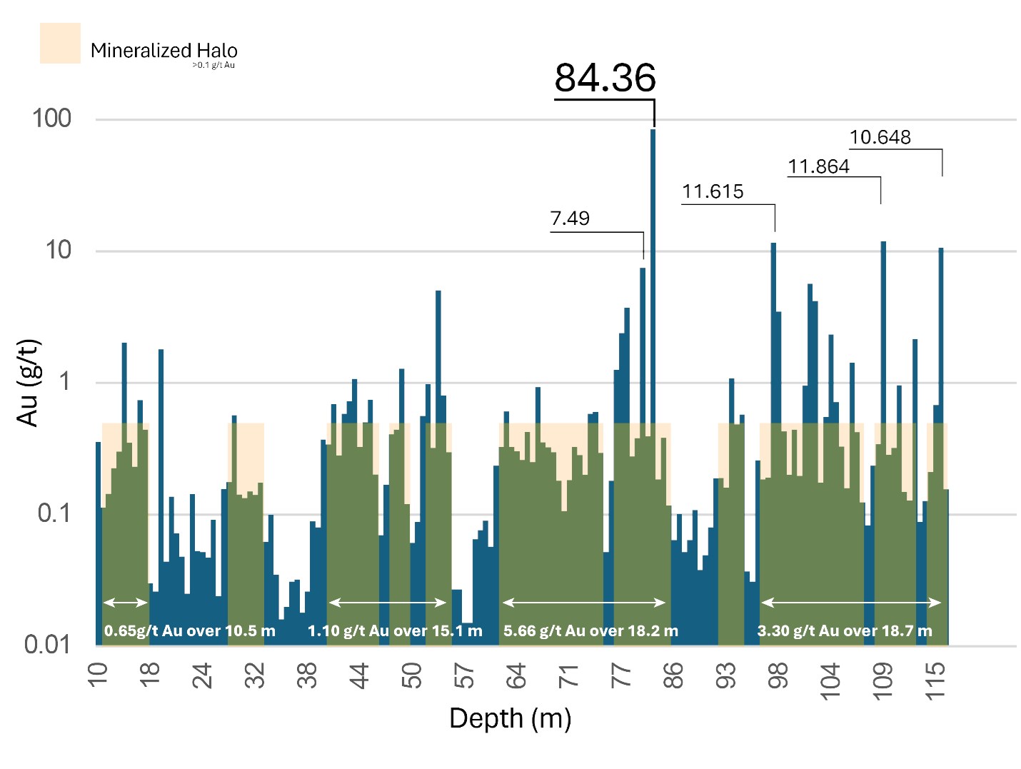 3.30 g/t Au over 18.7 m from 96.7 m to 115.3 m, including 5.49 g/t Au over 4.9 m, and 3.92 g/t over 4.1 m
