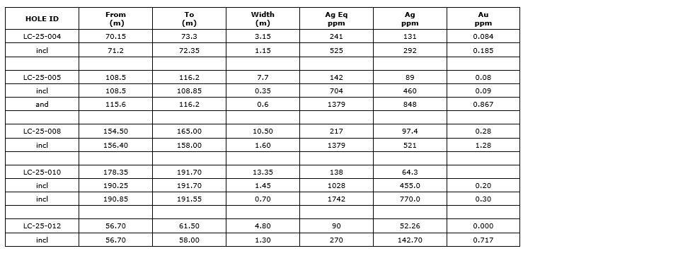 The 2025 drill program, the first on the property, intersected high-grade, shallow silver mineralization plus gold in five holes. All results were previously reported.