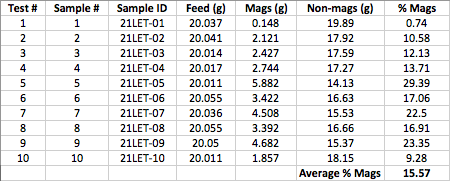1E/8FPX four-acid digestion method, analysis by ICP-ES). SGS ran 10 samples for concentrate (that is, heavy mineral separation) and arrived at the percentage of magnetic fraction.