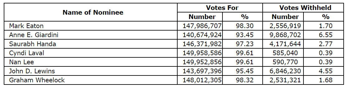 A total of 161,634,701 common shares, representing 68.99 per cent of the company's issued and outstanding common shares as at the record date, were voted. All of the company's seven director nominees were elected, and detailed results of the votes on directors are shown in an attached table.