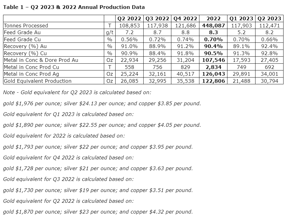 In May, a major milestone was achieved -- the commissioning of the final component of the stage 2A plant expansion, resulting in the doubling of rougher flotation circuit capacity. After commissioning, the process plant recorded a significant increase in metallurgical recoveries for gold and copper. In June, the first full month of the stage 2A expansion being fully commissioned, recoveries averaged 93 per cent for gold and 92.9 per cent for copper. Recoveries for Q2 averaged 92.4 per cent for gold and 92.8 per cent for copper, the highest since Q4 2021 for both gold and copper, and significantly higher than the 2022 average of 90.4 per cent for gold and 90.5 per cent for copper. Total ore processed during the quarter was 112,471 tonnes. With the stage 2A plant expansion now commissioned, optimization efforts are under way, including to increase throughput that the company believes has the potential to be materially greater than its nameplate design.