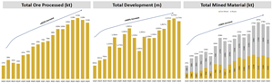 See Figure 1: Quarterly Total Ore Processed, Development Metres Advanced and Total Mined Material Chart