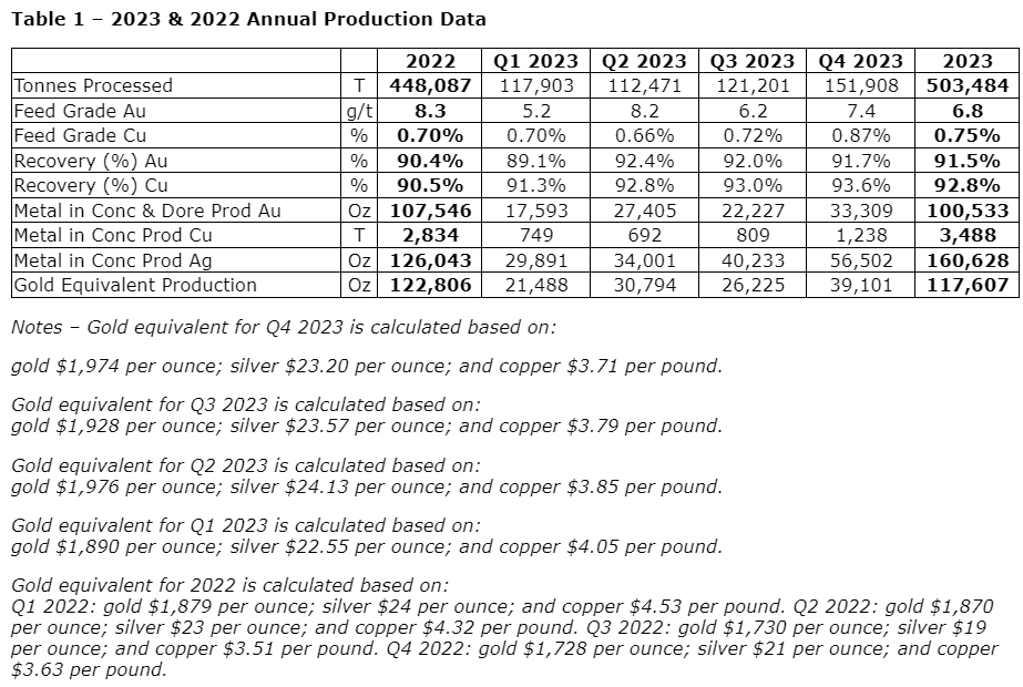 Concurrent with the record throughput rates, during the fourth quarter, the process plant delivered strong metallurgical recoveries of 91.7 per cent for gold and 93.6 per cent for copper. Head grades during the quarter averaged 8.7 grams per tonne (g/t) AuEq, or 7.4 g/t gold, 0.87 per cent copper and 13.9 g/t silver.