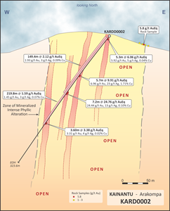 Additionally, results from hole KARDD0002 demonstrate potential for bulk mining at Arakompa. Between the lodes, the tonalite to dioritic host rock is mineralized, overprinted with porphyry style gold-copper mineralization. Hole KARDD0002 recorded a bulk intersection of 219.8 m at 1.59 g/t AuEq (112.1 m true thickness) with a higher grade core of 149.4m at 2.12 g/t AuEq (78.4 m true thickness), starting at 5.2 m from surface (see Figure 1). Importantly, hole KARDD0002 drilled approximately only two-thirds of the width of the mineralized corridor, with the eastern one-third untested and prospective as shown via rock samples, including 5.8 g/t Au and 11.6 g/t Au.