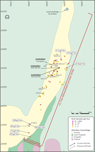• Between the high grade lodes, the tonalite to dioritic host rock is overprinted with porphyry style mineralization increasing the potential for bulk mining. Hole KARDD0002 recorded a bulk intersection of 219.8 m at 1.59 g/t AuEq with a higher grade core of 149.4m at 2.12 g/t AuEq, starting at 5.2 m from surface (see Fig 1). Importantly, hole KARDD0002 drilled only approximately two-thirds of the width of the mineralized corridor, with the eastern one-third untested (see Fig 2-3).