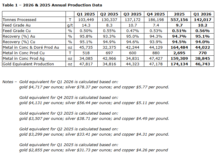 Strong metallurgical recoveries in Q1 of 95.1 per cent for gold and 94.0 per cent for copper, exceeding the updated definitive feasibility study (DFS) recovery parameters for gold (92.6 per cent) and performing in line for copper (94.2 per cent) (Jan. 1, 2024, effective date); the new 1.2-million-tonne-per-annum Stage 3 expansion process plant has continued to perform well since the commencement and completion of commissioning in September and December, 2025, respectively;