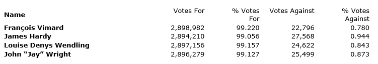 KP Tissue Inc. held its annual meeting of shareholders today. All candidates proposed as directors were duly elected to the board of directors of KP Tissue by a majority of the votes cast by shareholders present or represented by proxy at the meeting, as shown in the attached table.
