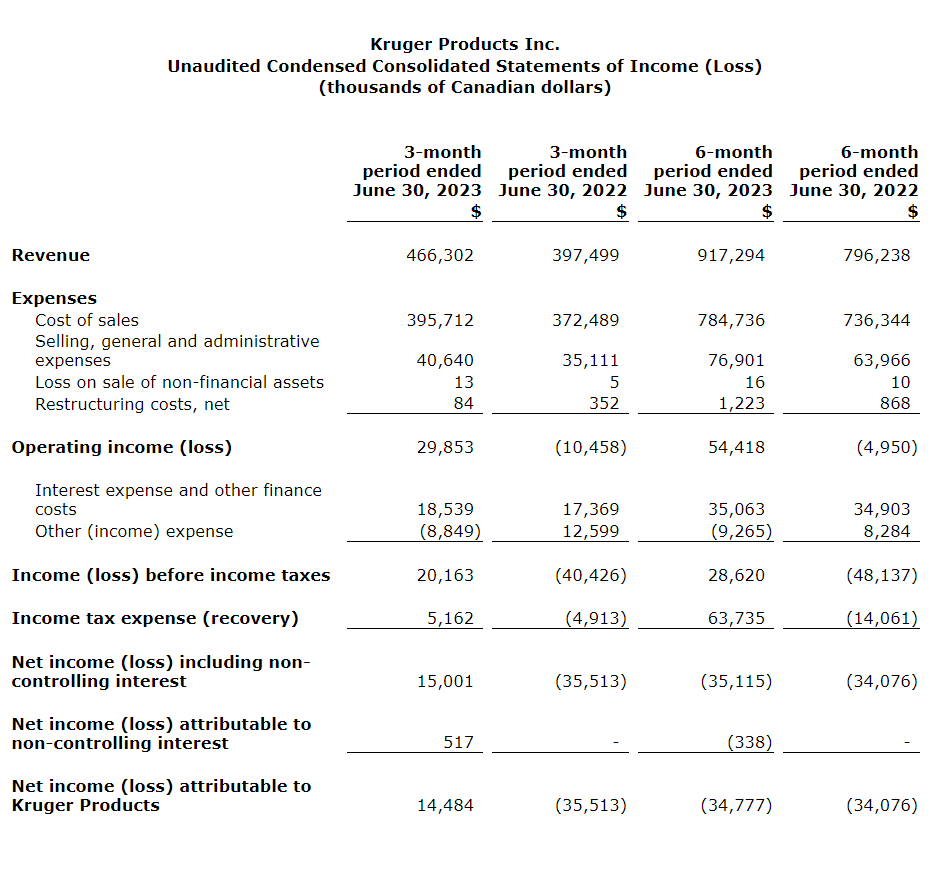 Kruger Products Q2 2023 financial results