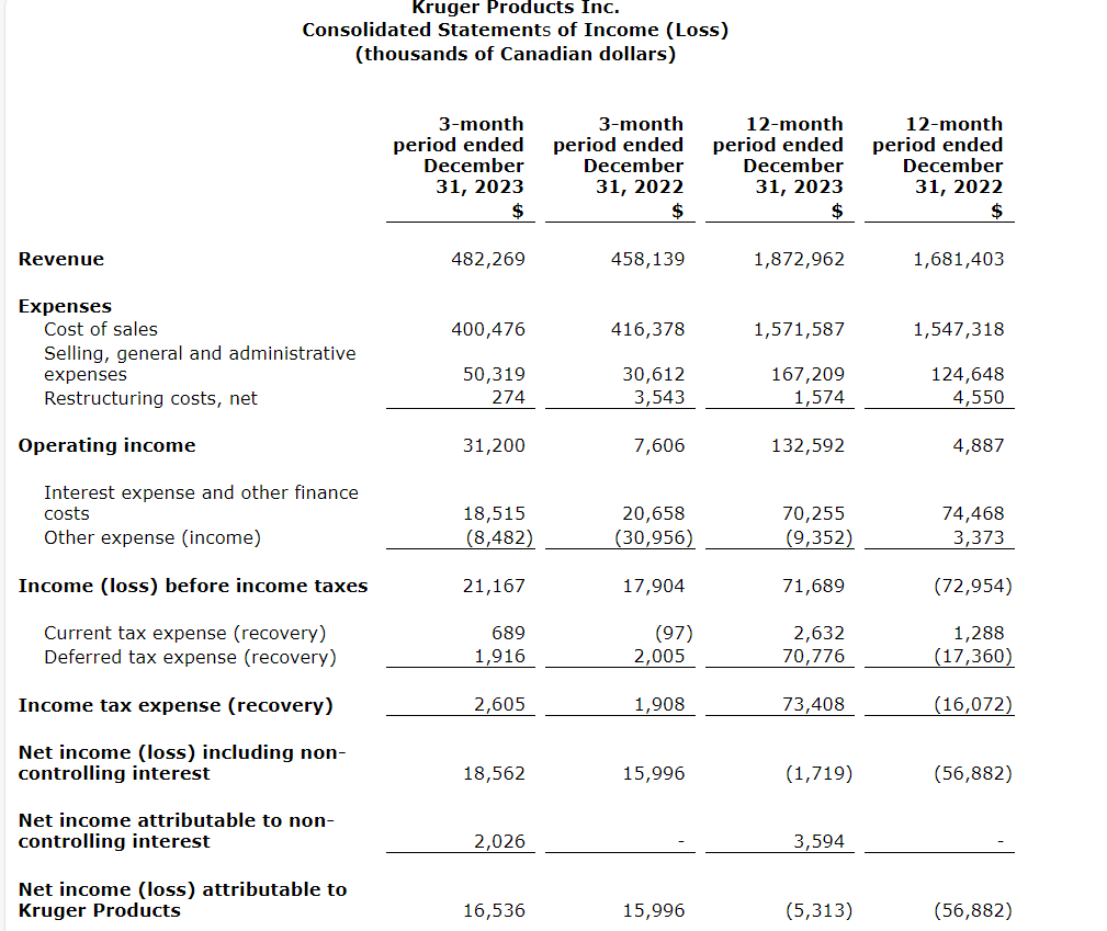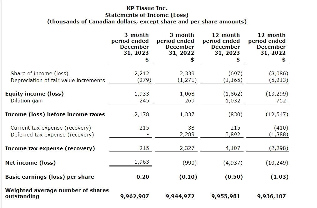 KP Tissue had net income of $2-million in Q4 2023. Included in net income was $2.2-million representing KP Tissue's share of Kruger Products' net income, a dilution gain of $300,000, depreciation expense of $300,000 related to adjustments to carrying amounts on acquisition and an income tax expense of $200,000.