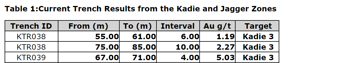 KTR038 -- 1.19 g/t Au over six m and 2.27 g/t Au over 10 m (Kadie 3);