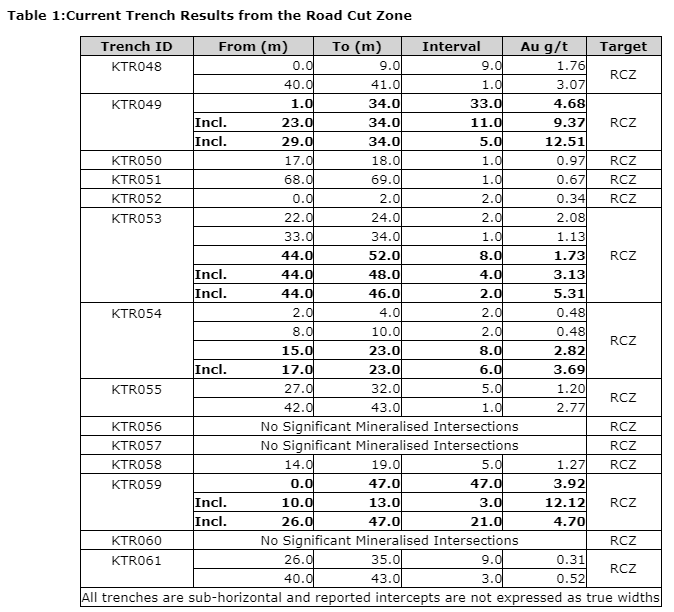 m at the Road Cut Zone. Trench KTR053 has returned 8 m at 1.73 g/t Au, including 4 m at 3.13 g/t Au and 2 m at 5.31 g/t Au, with trench KTR054 returning 8 m at 2.82 g/t Au, including 6 m at 3.69 g/t Au, both located at the southern end of the road exposure (see Figure 1 and Table 1 for detailed results). These findings provide confirmation that there is a gold in soil anomaly under overburden east of the road, which remains largely unexplored. Additionally, these results are further supported by initial drill results at the Road Cut Zone (see press release August 14, 2023).