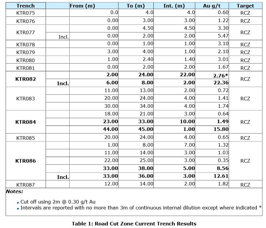 Additional sampling was undertaken at the previously reported mineralised zone (see press release dated December 5, 2023) east of the main RCZ in a series of small trenches located within the artisanal mine workings where it was safe to conduct activities (trenches KTR075 to KTR081). Results from this work (see Table 1 for interval results and Figure 1 for locations) confirm the presence of a northerly trending shear with gold mineralisation. In the trenches sampled, the northerly shear was dominant, and the highest gold grades are associated with the cross-cutting vein sets as described previously.
